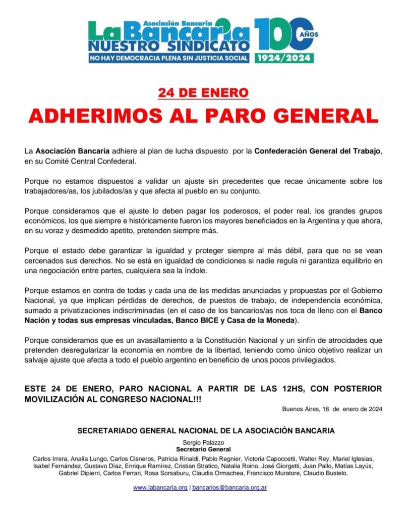 El miércoles 24 de enero no habrá bancos por la adhesión de La Bancaria al paro de la CGT.