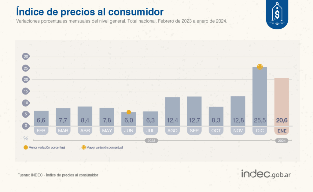 El Instituto Nacional de Estadística y Censos informó este miércoles que el Índice de Precios al Consumidor subió 20,6% durante enero de 2024.