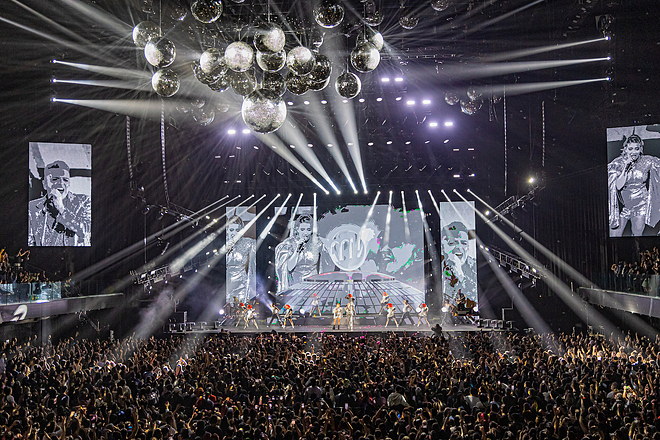 El final de cada show se transformó en una fiesta sin igual cuando 40 bolas de espejos de diversos tamaños colgaron del techo, iluminadas para reflejar destellos por todo el estadio, convirtiendo el Movistar Arena en una enorme discoteca.