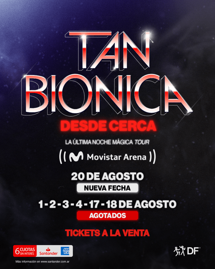 La banda Tan Bionica, en el marco de su gira «Última Noche Mágica Tour», ha anunciado una séptima fecha en el Movistar Arena de Buenos Aires debido a la gran demanda de entradas. Las presentaciones iniciales de los días 1, 2, 3, 4 y 17 de agosto ya están agotadas, y solo quedan algunos tickets para el 18 de agosto. La nueva fecha añadida será el 20 de agosto.