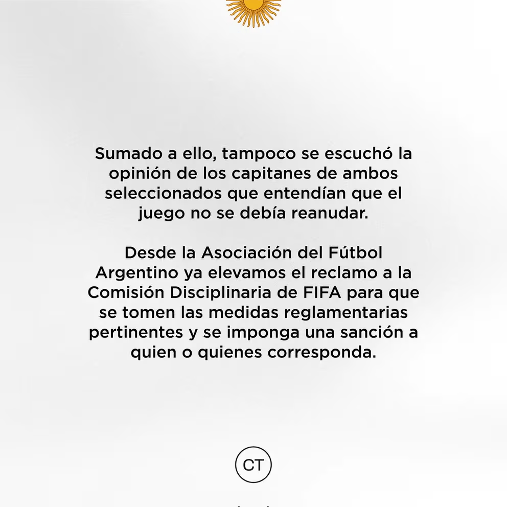 Además, Tapia subrayó que no se consideró la opinión de los capitanes de ambos equipos, quienes estaban de acuerdo en que el partido no debía reanudarse. “Desde la Asociación del Fútbol Argentino ya elevamos el reclamo a la Comisión Disciplinaria de la FIFA para que se tomen las medidas reglamentarias pertinentes y se imponga una sanción a quien o quienes corresponda”, concluyó.