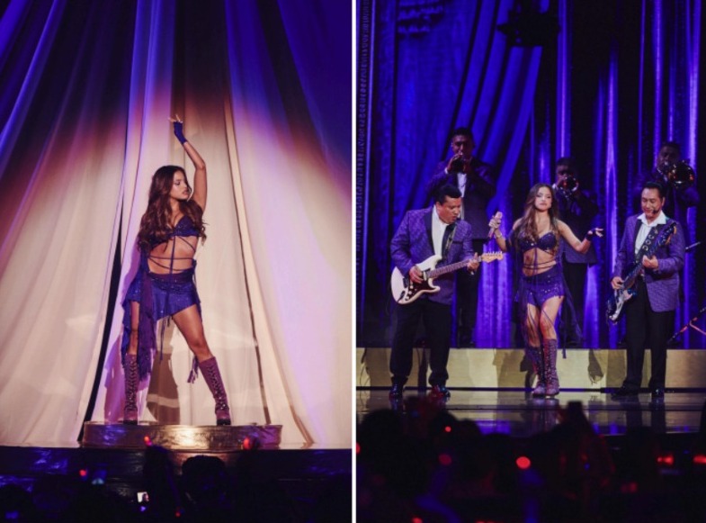 La noche continuó con «Perdonarte ¿Para Qué?», donde Emilia lució un vestido de manga larga personalizado y unas deslumbrantes botas con purpurina violeta de Bonet Studio. La colaboración con Los Ángeles Azules le dio a Emilia su primer #1 en las listas de Billboard U.S. Latin Airplay y Regional Mexican Airplay. Esta canción marca un hito importante en su carrera, demostrando su capacidad para cruzar fronteras musicales y cautivar audiencias internacionales.
