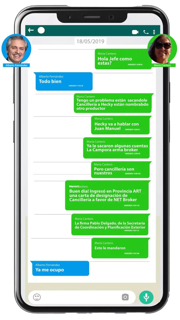 Uno de los mensajes de Cantero a su esposo, el broker Héctor Martínez Sosa, revela gestiones para incrementar los negocios de su marido con organismos públicos: «Tengo un problema, están sacándole Cancillería a Hecky… La Cámpora arma broker. Pero Cancillería son nuestros». La respuesta de Fernández fue: «Ya me ocupo».