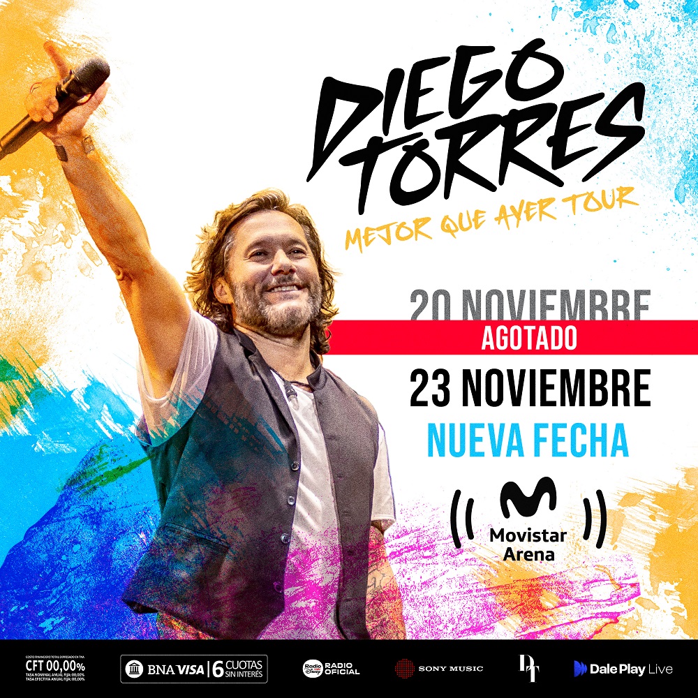 El reconocido cantante Diego Torres, en el marco de su exitosa gira «Mejor Que Ayer Tour», ha sumado una nueva fecha en el Movistar Arena de Buenos Aires tras agotar las entradas para su primer show. El artista se presentará el próximo 23 de noviembre en la capital argentina, y las entradas estarán disponibles a partir de mañana, 15 de agosto, a las 13:00 horas, a través de www.movistararena.com.ar.