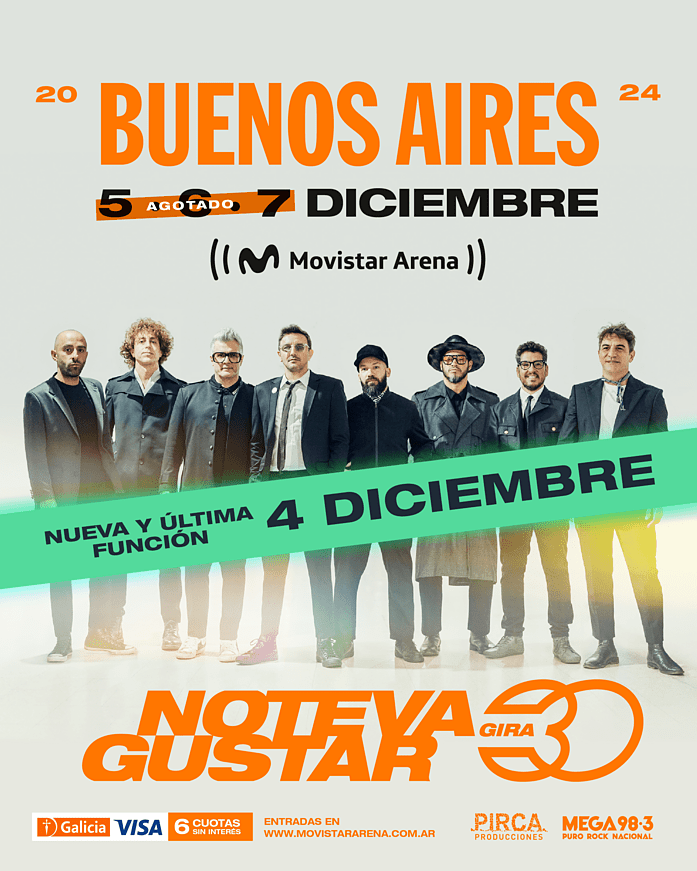 La banda uruguaya No Te Va Gustar (NTVG) sigue celebrando sus tres décadas de trayectoria con una gira internacional que está batiendo récords. Con casi 70 shows en 15 países diferentes, la banda ha consolidado su lugar en la escena musical latinoamericana. Debido a la alta demanda, han anunciado una nueva función el 4 de diciembre en el Movistar Arena de Buenos Aires, sumándose a las tres fechas previamente agotadas (5, 6 y 7 de diciembre).
