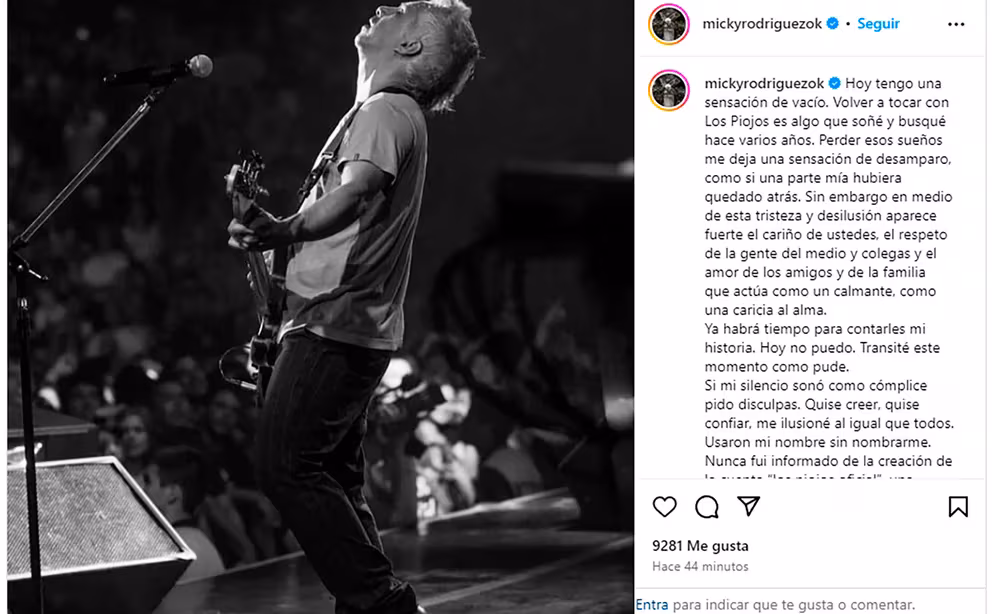 El bajista y fundador de Los Piojos, Micky Rodríguez, confirmó que no formará parte del esperado regreso de la banda, anunciado para diciembre de este año, generando un fuerte impacto entre los fanáticos. A través de un emotivo posteo en sus redes sociales, Micky expresó su tristeza y desilusión, afirmando que no fue informado ni consultado sobre los detalles de la vuelta de la banda, a pesar de haber sido etiquetado en publicaciones oficiales.